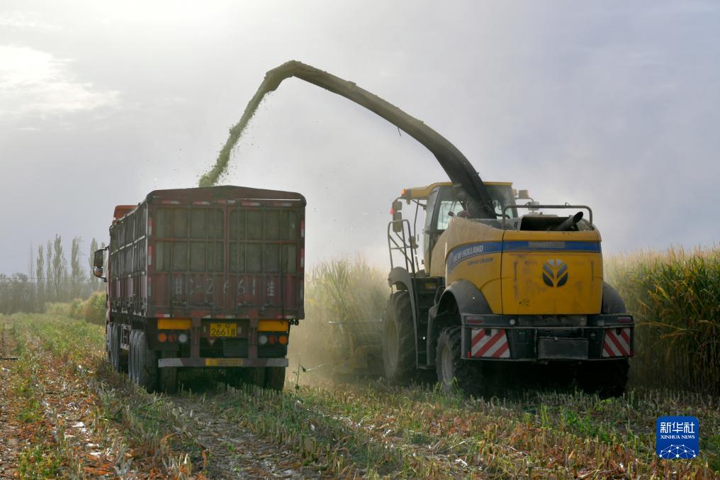 9月5日,在張掖市山丹縣位奇鎮四壩村,工作人員使用大型機械收獲青貯玉米。