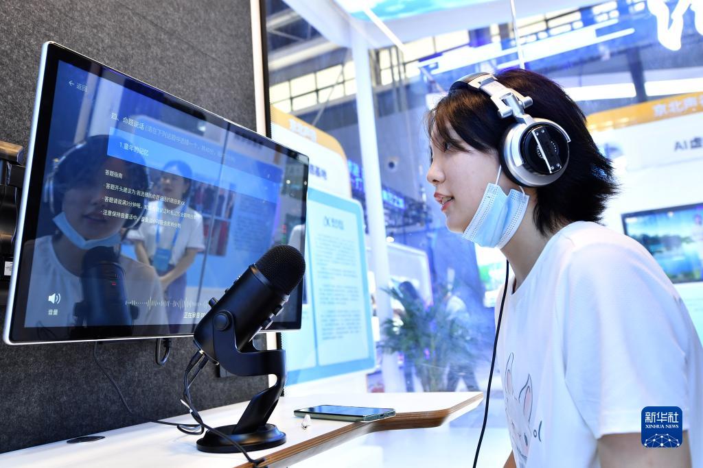 9月7日,參觀(guān)者在2023中國國際數字經(jīng)濟博覽會(huì )上體驗科大訊飛AI朗讀亭。