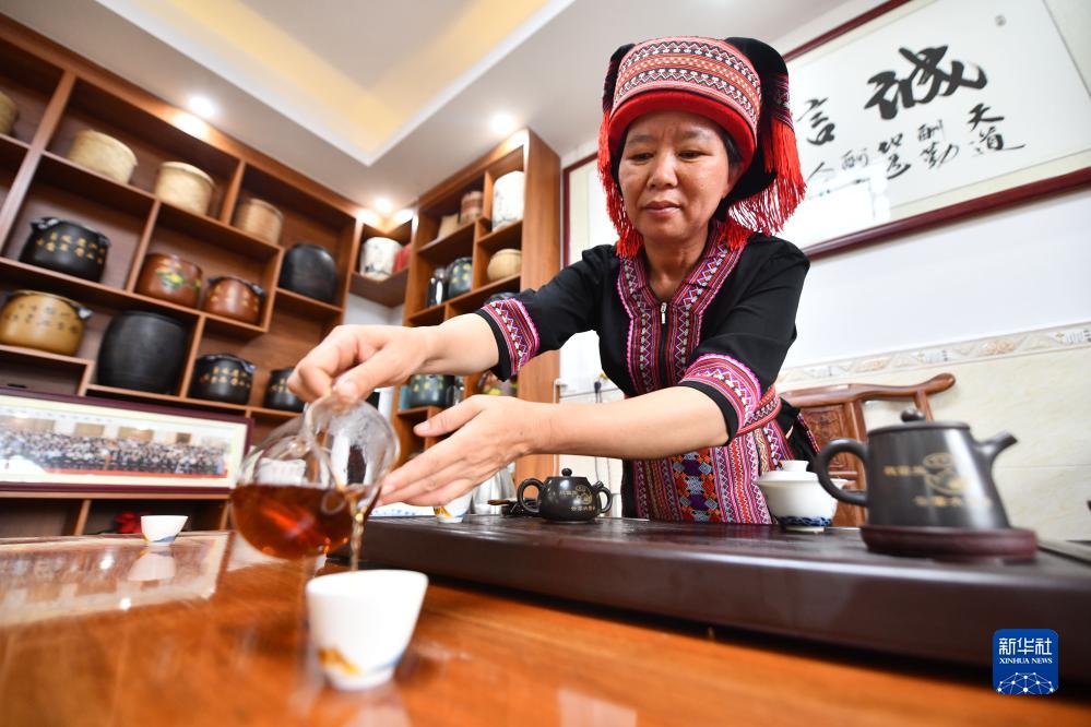 在梧州市蒼梧縣六堡鎮山坪村,六堡茶制作技藝非遺傳承人祝雪蘭在工作室里泡茶(6月7日攝)。