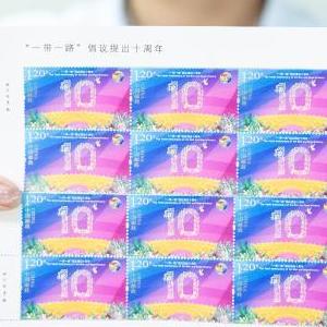 9月7日,中國郵政發(fā)行《“一帶一路”倡議提出十周年》紀念郵票一套1枚,郵票圖案以花卉、和平鴿,以及代表基礎設施合作和互聯(lián)互通概念的公鐵運輸車(chē)輛、貨輪、起重機等元素共同組成的數字“10”為主體,并結合“絲路金橋”元素。郵票由北京郵票廠(chǎng)有限公司影寫(xiě)工藝印制,另與香港郵政、澳門(mén)郵電共同印制同題材小本票1本。全套郵票面值1.20元,計劃發(fā)行數量705萬(wàn)套。