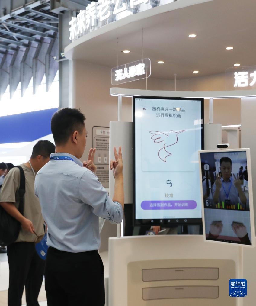 9月7日,參觀(guān)者在外灘大會(huì )展覽區未來(lái)養老公寓展臺上體驗AI大腦訓練游戲。