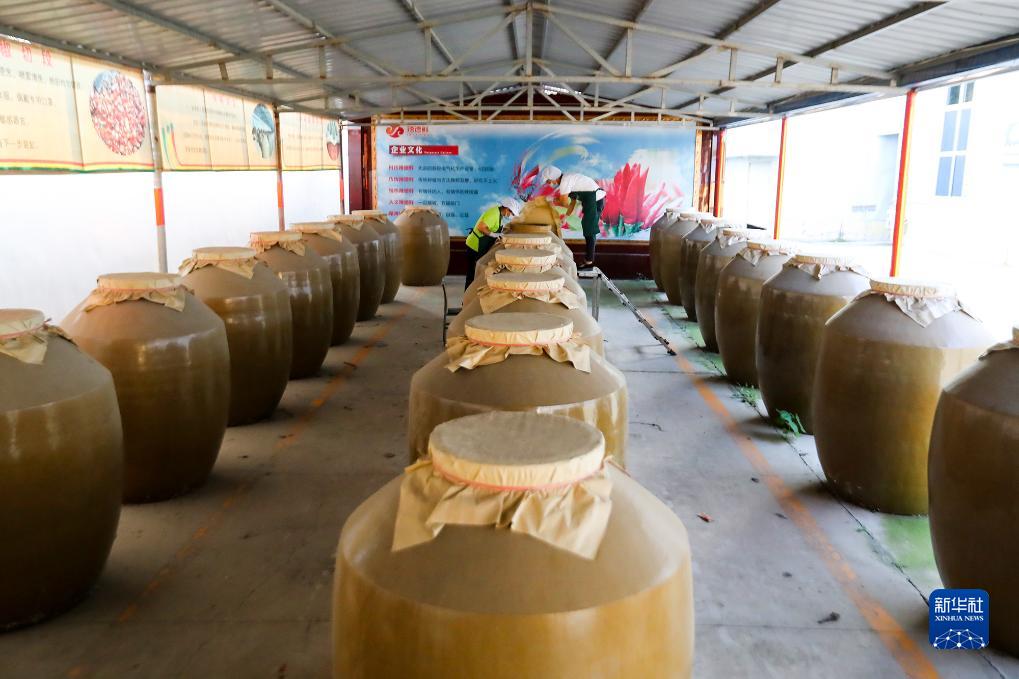 9月6日,在河南省商丘市柘城縣辣椒醬生產(chǎn)企業(yè),工作人員在清理醬缸。
