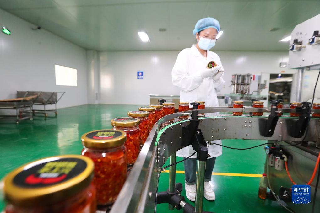 9月6日,在河南省商丘市柘城縣辣椒醬生產(chǎn)企業(yè),工作人員在灌裝生產(chǎn)線(xiàn)上工作。