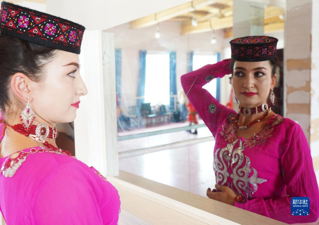 在新疆塔縣帕米爾旅游區游客服務(wù)中心,古麗巴努爾·庫爾恰克在排練室對鏡整理服飾,準備當天下午的迎賓演出(9月4日攝)。
