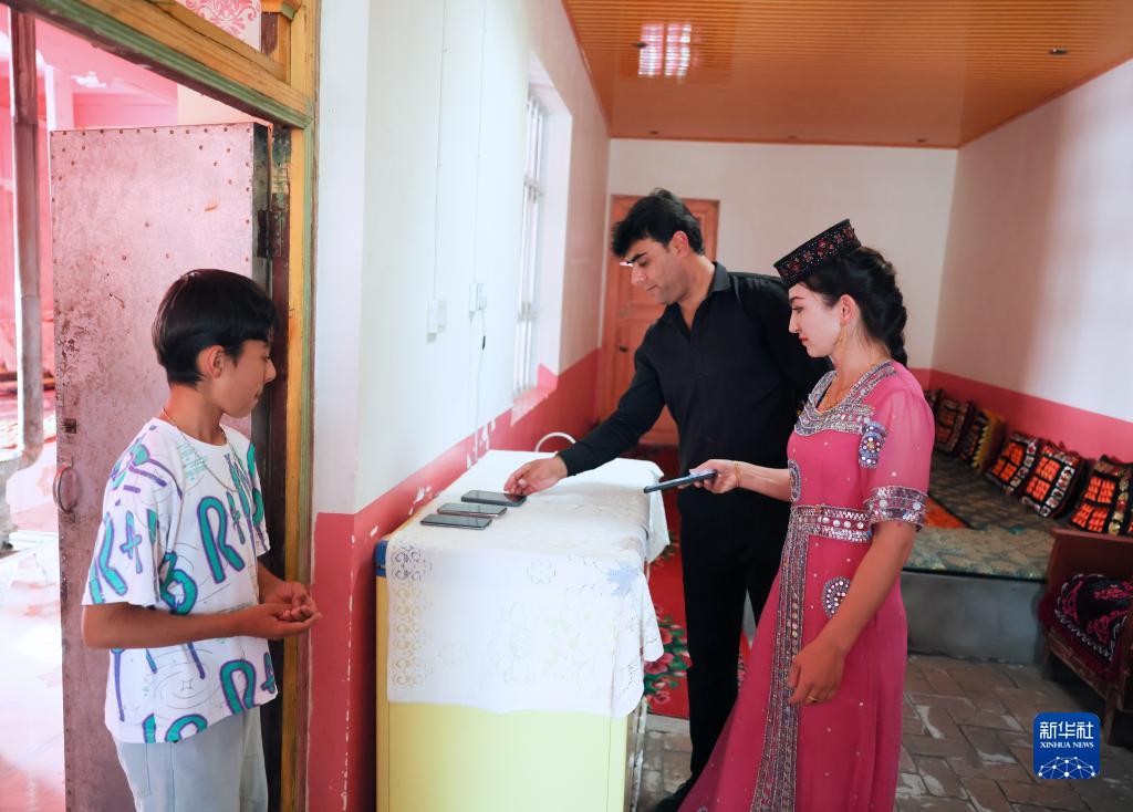 晚飯前,為了讓家人能好好聊天交流感情,拜合提亞爾·居馬汗和妻子將手機放在另外一個(gè)屋子(9月4日攝)。