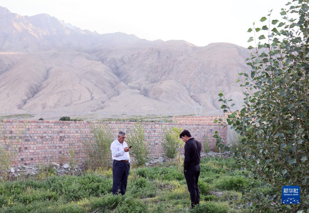 拜合提亞爾·居馬汗(右)和父親站在自家院子里(9月4日攝)。