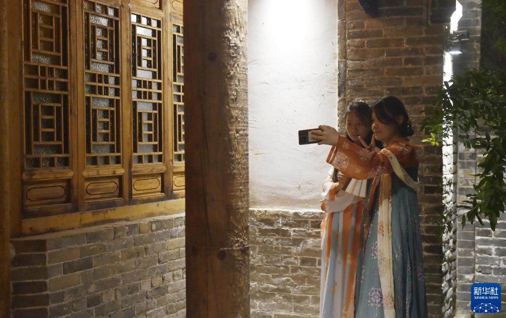 9月7日晚,身穿古裝的游人在安陽(yáng)古城倉巷街的夜游活動(dòng)現場(chǎng)拍照。
