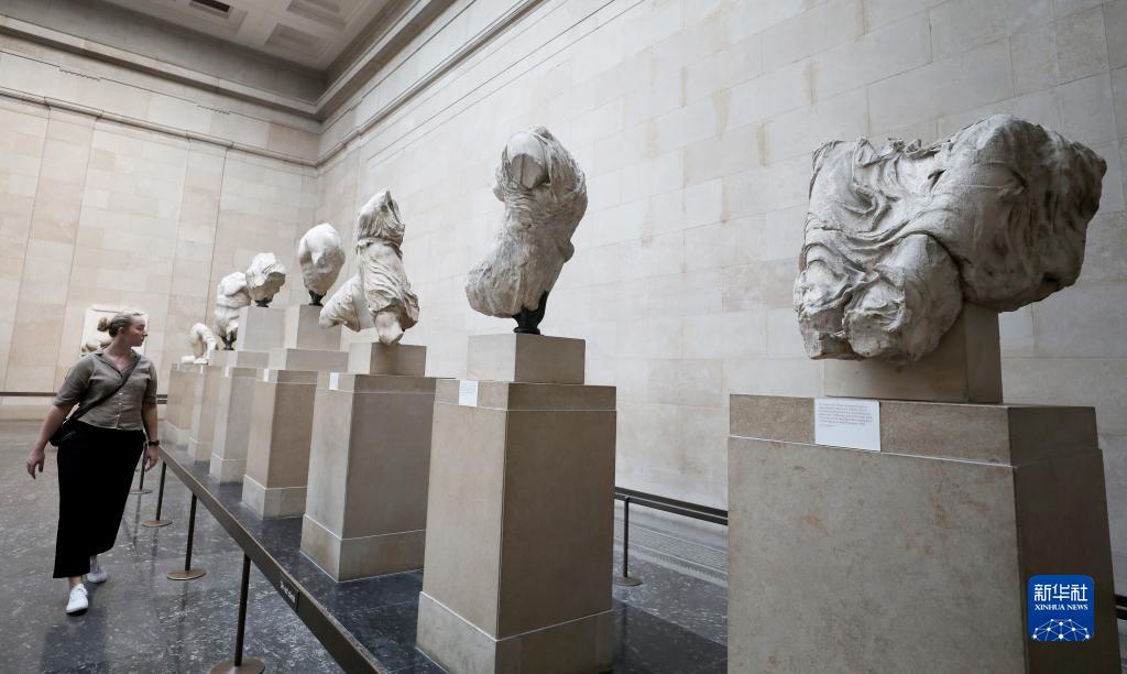 9月7日,一名女子在英國倫敦大英博物館參觀(guān)帕特農神廟大理石雕刻。