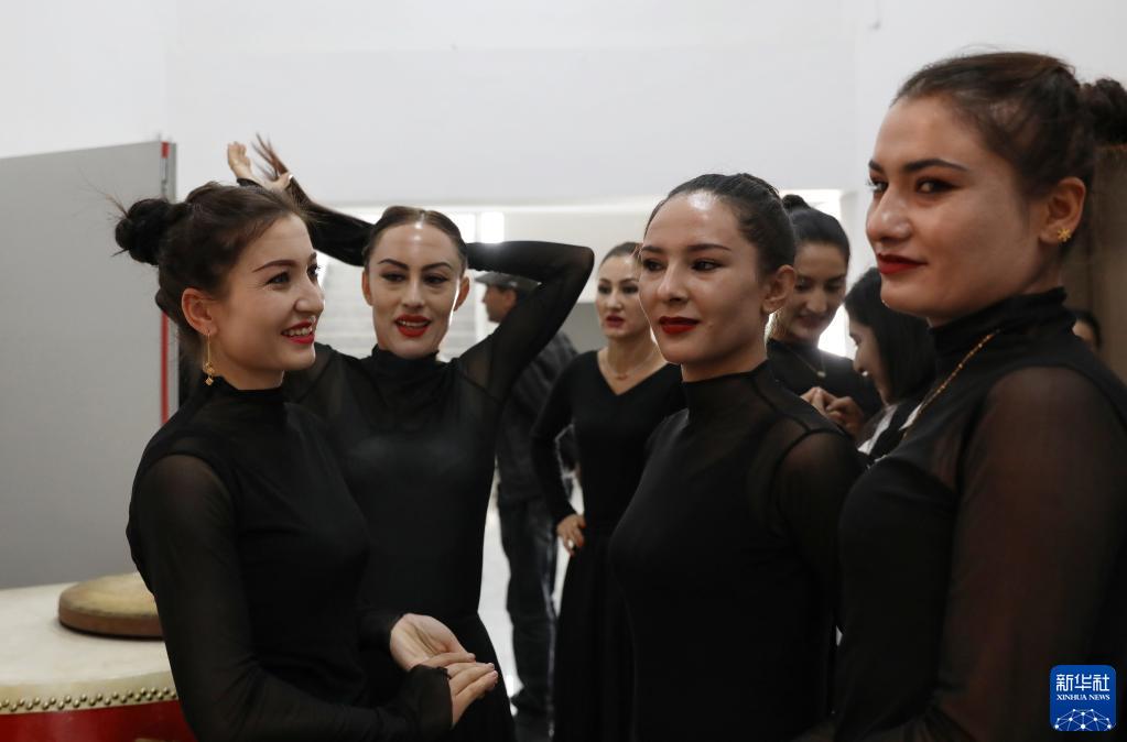 新疆塔縣文工團舞蹈演員古麗巴努爾·庫爾恰克(左一)和同伴們在塔縣文化服務(wù)中心劇場(chǎng)后臺等候排練(9月4日攝)。新華社記者 程婷婷 攝