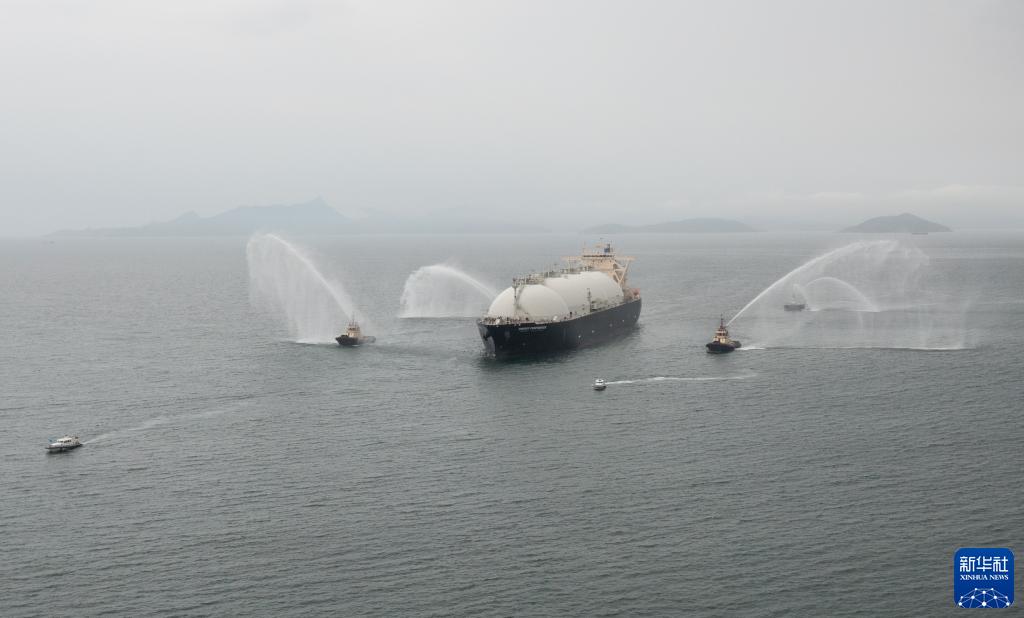 9月7日,搭載著(zhù)來(lái)自澳大利亞的6.5萬(wàn)噸進(jìn)口LNG的“能量自信”號運輸船駛入廣東大鵬液化天然氣(LNG)接收站時(shí)舉行過(guò)“水門(mén)”儀式(無(wú)人機照片)。