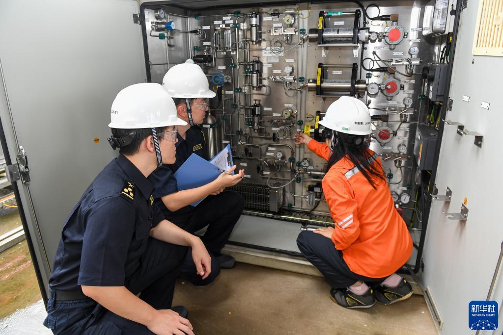 9月7日,廣東大鵬液化天然氣(LNG)接收站工作人員在深圳海關(guān)關(guān)員監管指導下進(jìn)行LNG取樣。