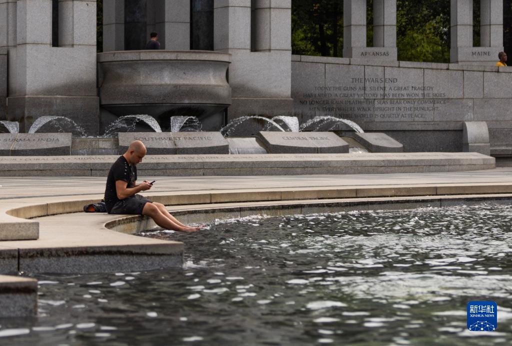 9月7日,在美國首都華盛頓,游客在二戰紀念碑旁的水池邊休息納涼。