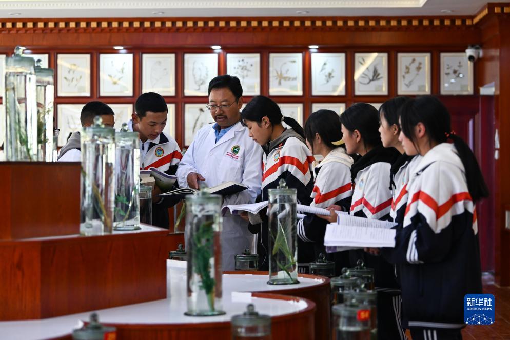 9月8日,在果洛藏族自治州職業(yè)技術(shù)學(xué)校,藏醫醫療與藏藥專(zhuān)業(yè)學(xué)生在草藥標本館內學(xué)習辨認藥材。
