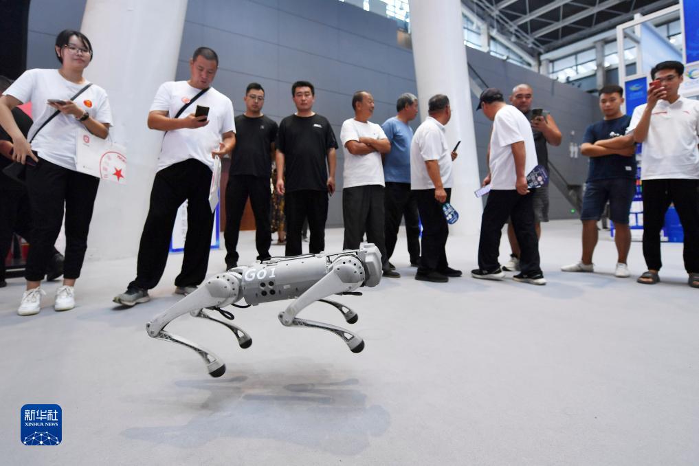 9月8日,參觀(guān)者在數博會(huì )上觀(guān)看四足機器人表演。