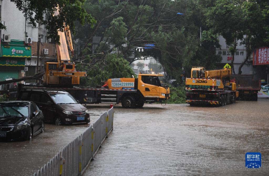 9月8日,在廣州市番禺區康樂(lè )路,工作車(chē)輛在清理倒伏樹(shù)木。