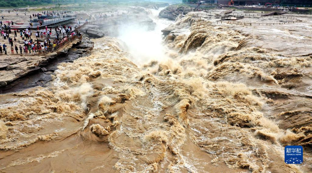 近日,受上游降雨和水庫調節放水影響,黃河壺口瀑布主副瀑布連成一線(xiàn),滾滾黃河水奔騰而下,吸引游客駐足觀(guān)看。