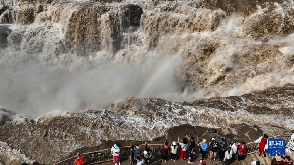 9月8日,游客在黃河壺口瀑布景區游覽(無(wú)人機照片)。