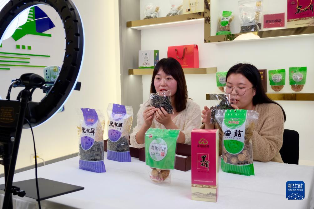 9月8日,在山陽(yáng)縣食用菌產(chǎn)業(yè)園內,銷(xiāo)售人員在電商直播間向網(wǎng)友推薦食用菌產(chǎn)品。