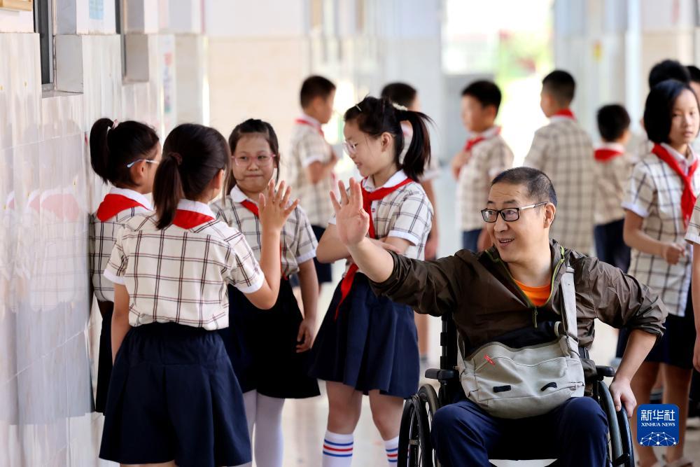 9月5日,在山東省棗莊市永安鎮遺棠小學(xué),楊季剛在去教室路上與同學(xué)拍手互動(dòng)。