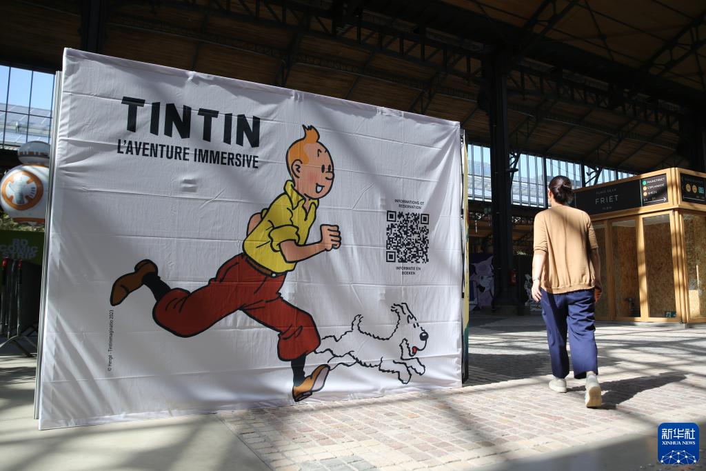 9月8日,在比利時(shí)布魯塞爾,一名參觀(guān)者從布魯塞爾漫畫(huà)節上的《丁丁歷險記》展板旁走過(guò)。