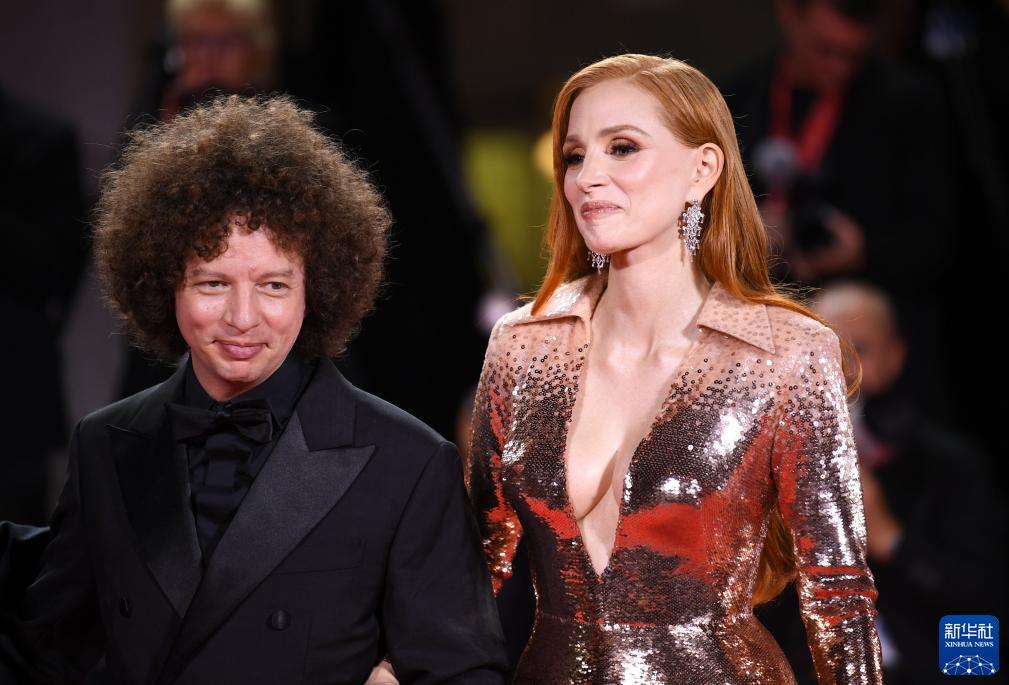 9月8日,在意大利威尼斯,電影《記憶》導演米歇爾·佛朗哥(左)和演員杰西卡·查斯坦亮相首映式紅毯。