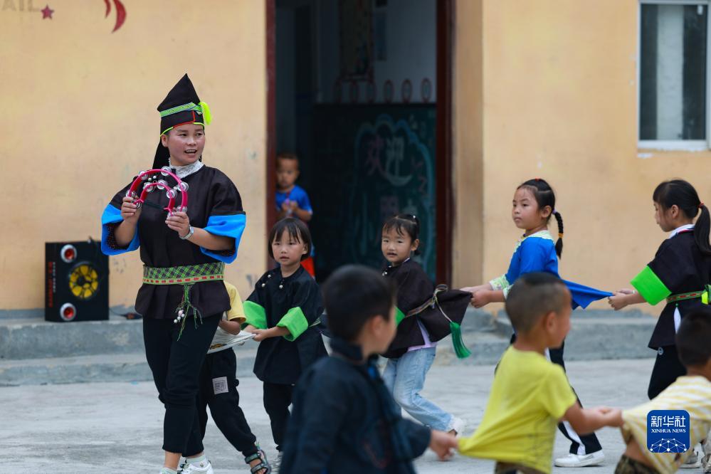 柳吉小學(xué)教師王章艷帶領(lǐng)學(xué)生在課間玩游戲(9月7日攝)。