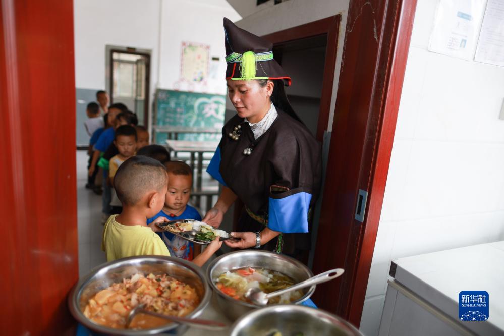 柳吉小學(xué)教師王章艷在食堂給學(xué)生打飯(9月7日攝)。