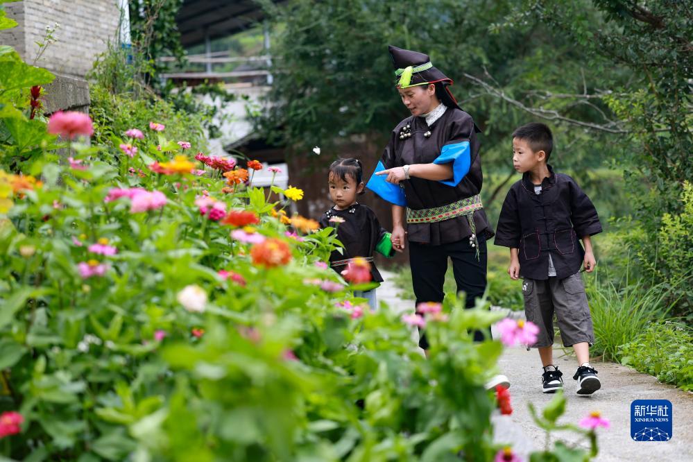 柳吉小學(xué)教師王章艷(中)在去往學(xué)生龍運平(右)和龍運凡家中家訪(fǎng)的路上(9月7日攝)。