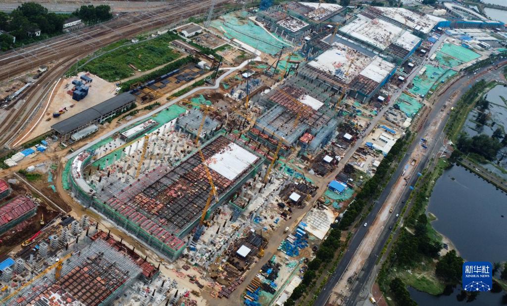這是9月9日拍攝的??谛潞8酆湍细邸岸€(xiàn)口岸”(貨運)集中查驗場(chǎng)所建設項目(無(wú)人機照片)。