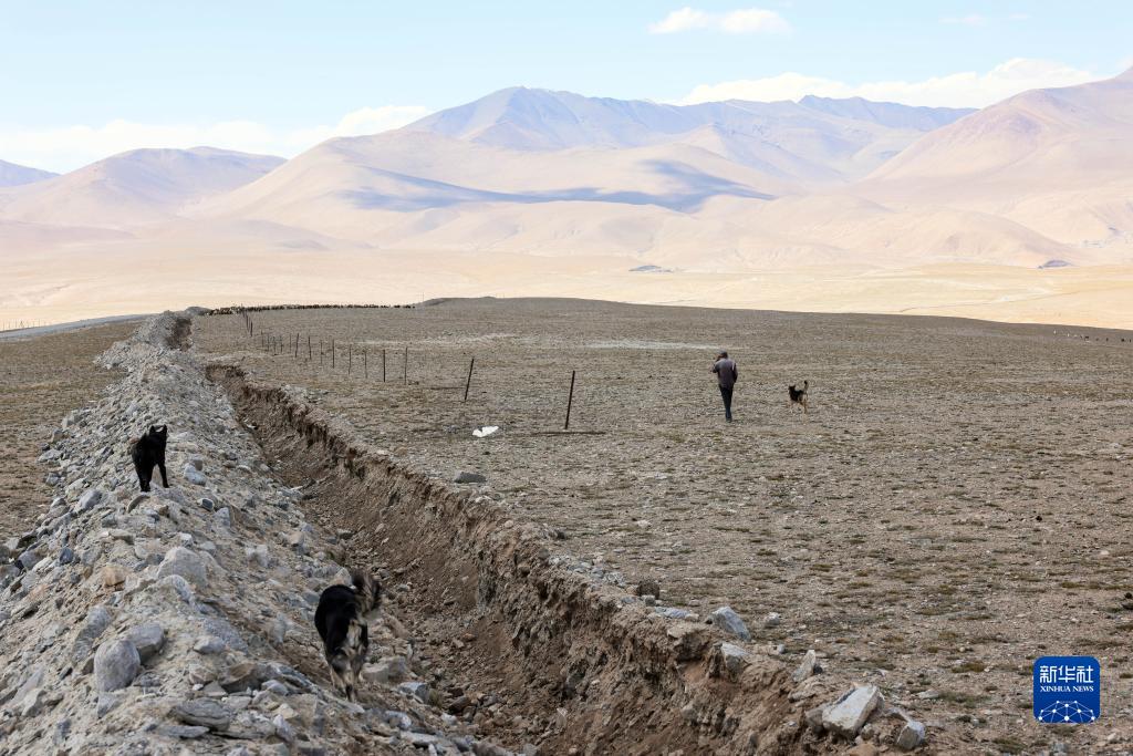 今年39歲的塔合曼鄉薩熱拉村牧民庫爾班艾里·買(mǎi)達賽因和牧羊犬一起追趕羊群(9月6日攝)。
