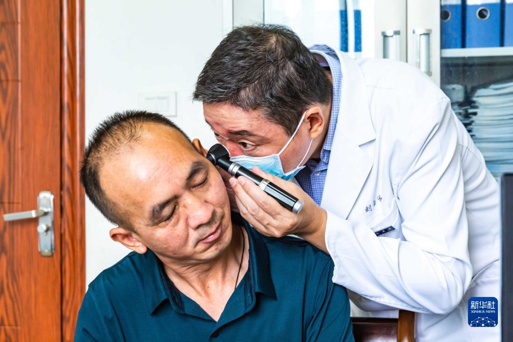 9月9日,首都醫科大學(xué)附屬北京友誼醫院耳鼻咽喉頭頸外科主任劉玉和醫生在貴州省安順市中醫院為患者做檢查。
