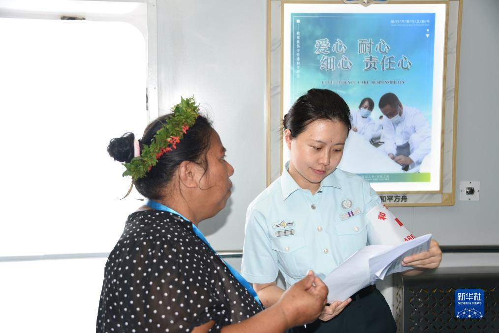 中國海軍“和平方舟”號醫院船在基里巴斯開(kāi)展醫療服務(wù)期間,一名文職醫生為患者解讀化驗報告(7月15日攝)。