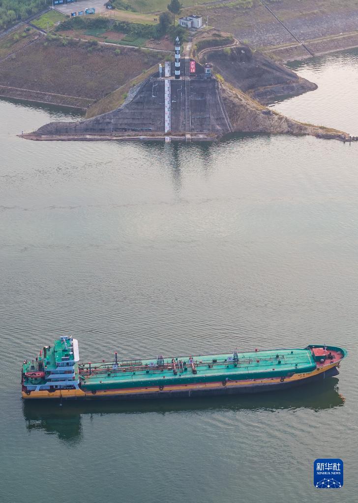 9月10日,船舶從三峽大壩上游長(cháng)江水文標尺前開(kāi)過(guò)(無(wú)人機照片)。