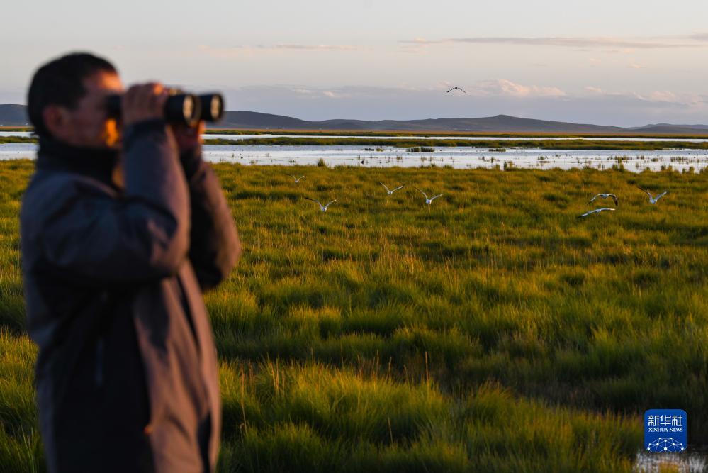 濕地生態(tài)管護員如科在四川省阿壩藏族羌族自治州若爾蓋縣花湖用望遠鏡觀(guān)察周邊環(huán)境(8月22日攝)。