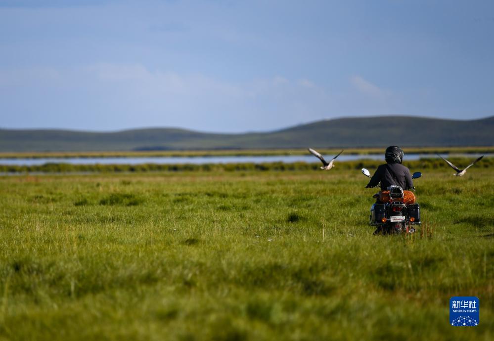 濕地生態(tài)管護員如科騎著(zhù)摩托車(chē)在四川省阿壩藏族羌族自治州若爾蓋縣花湖周?chē)膊椋?月22日攝)。