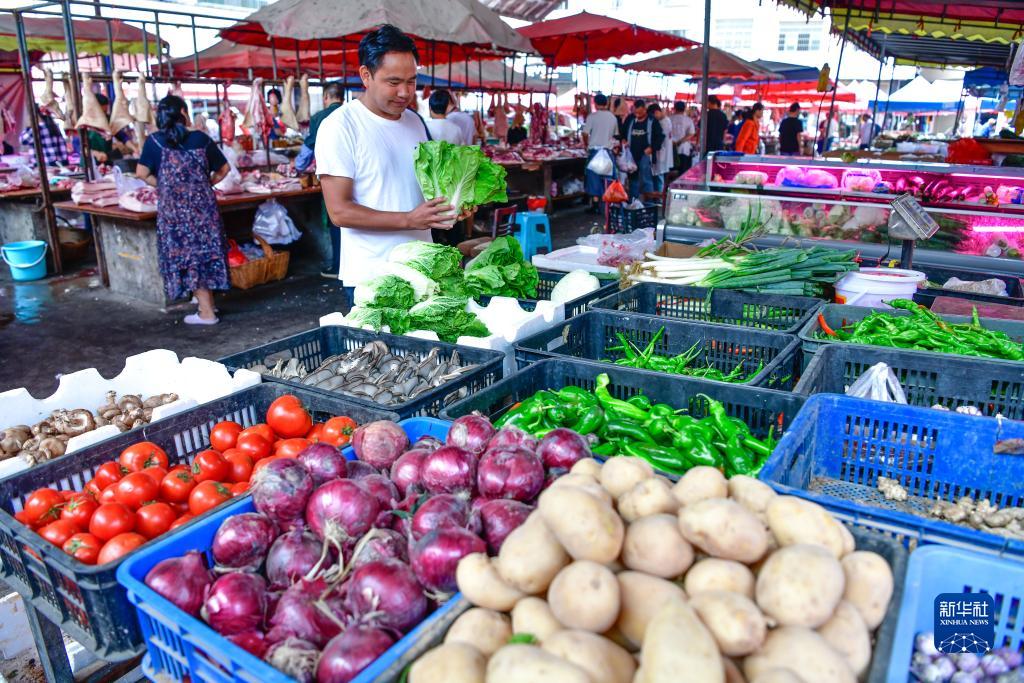 陸成文在鄉鎮集市上選購學(xué)生營(yíng)養餐食材(9月7日攝)。