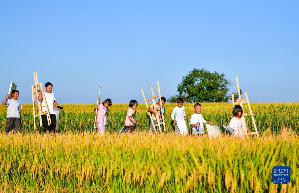 陸成文(左二)、工勤人員潘德祿(左一)與學(xué)生在臘利梯田上寫(xiě)生歸來(lái)(9月6日攝)。