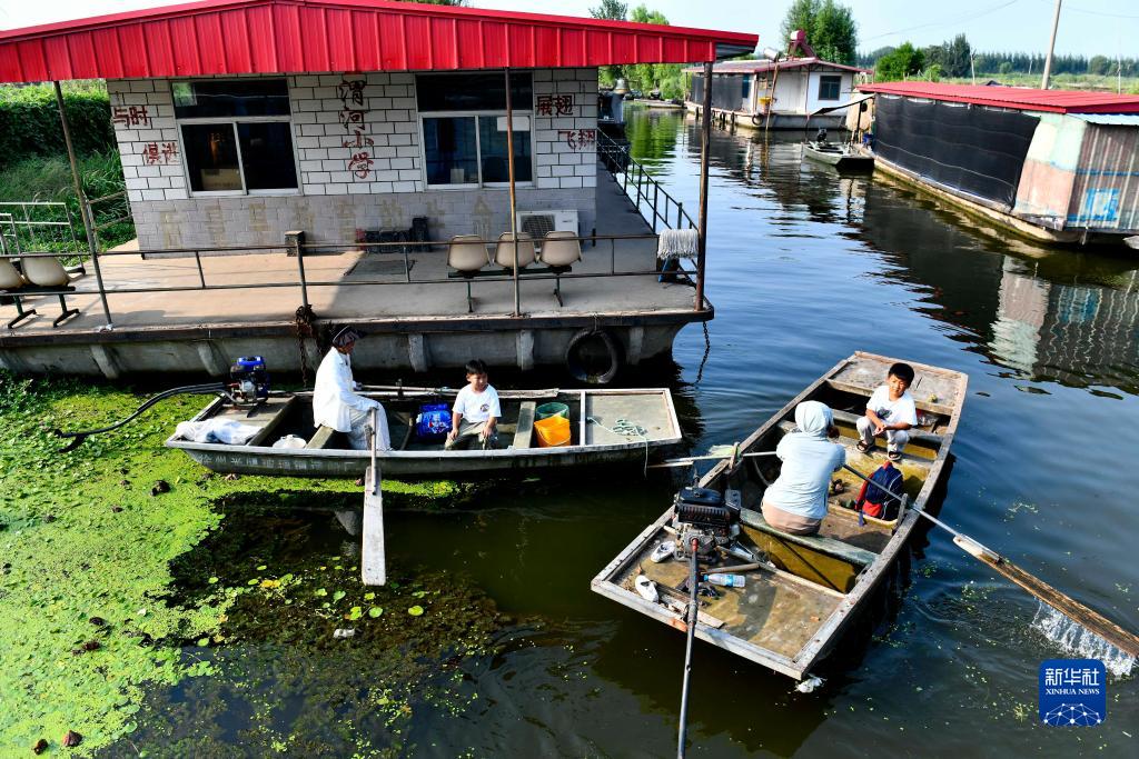 9月5日,在微山縣高樓鄉渭河小學(xué),放學(xué)后家長(cháng)劃船接孩子回家。