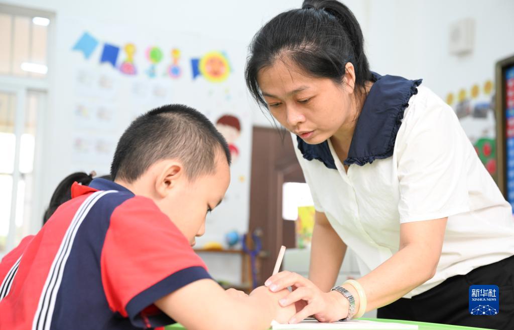 在海南(??冢┨厥饨逃龑W(xué)校啟智三(1)班,班主任符堯惠(右)指導學(xué)生寫(xiě)字(9月6日攝)。