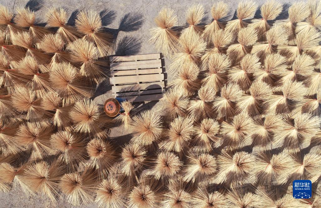 9月10日,在湖南省婁底市雙峰縣石牛鄉一竹制品生產(chǎn)企業(yè),工人在晾曬竹制半成品(無(wú)人機照片)。