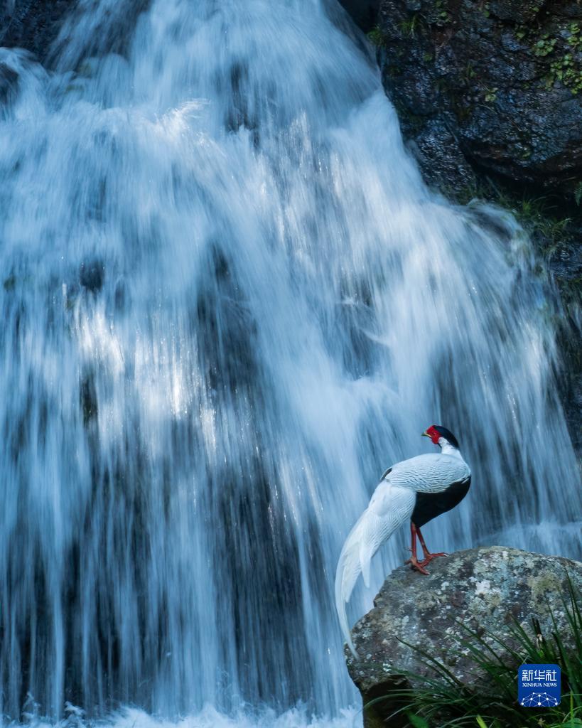 9月9日,一只白鷴停留在瀑布旁的石頭上。