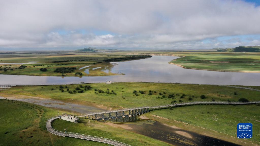 這是8月22日在四川省阿壩藏族羌族自治州若爾蓋縣唐克鎮拍攝的黃河九曲第一灣景色(無(wú)人機照片)。
