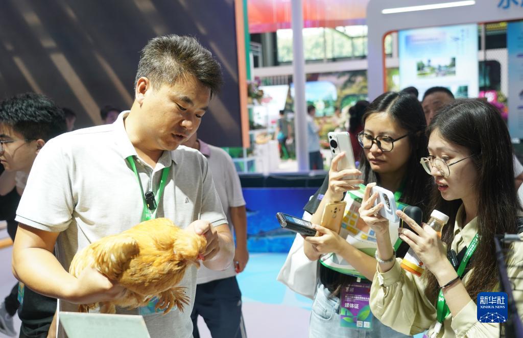 9月11日,在第三十屆中國北京種業(yè)大會(huì )種業(yè)振興成果展現場(chǎng),工作人員(前左)向媒體記者介紹北京油雞。