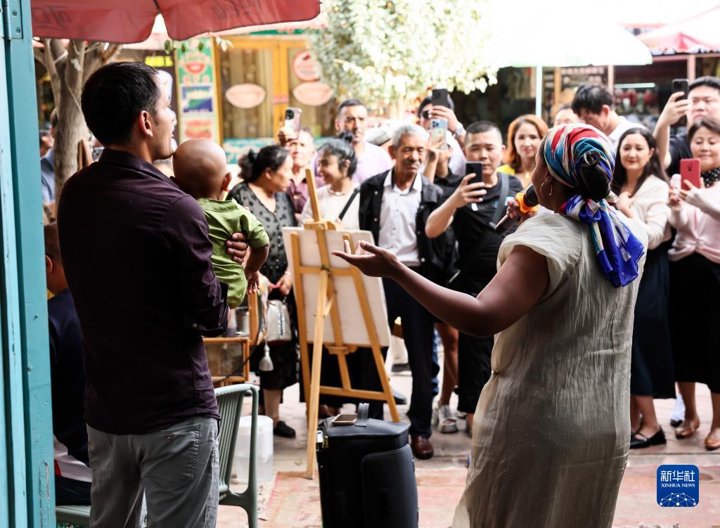 海迪雅(前右)在自家咖啡館前唱歌,丈夫迪力夏提抱著(zhù)孩子與她互動(dòng)(9月7日攝)。