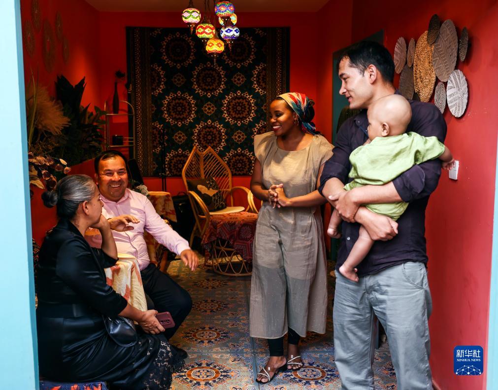 在自家咖啡館前,迪力夏提(右)抱著(zhù)孩子和海迪雅與游客交流(9月7日攝)。