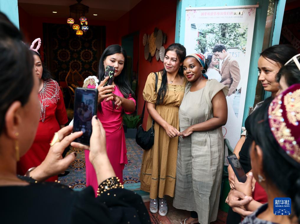 游客在咖啡館前和海迪雅(中右)合影留念(9月7日攝)。