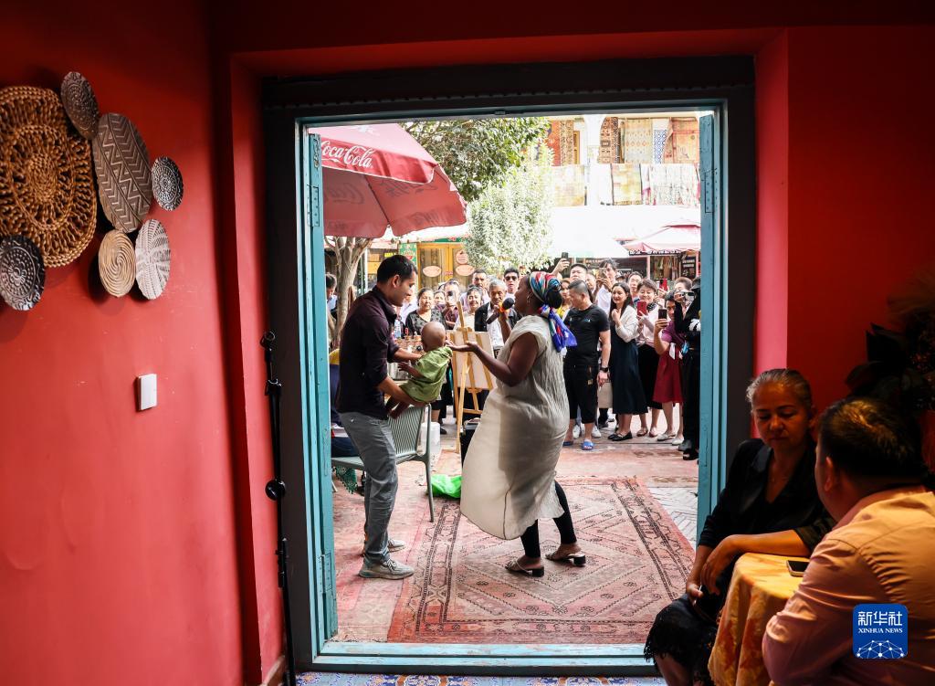 海迪雅(中)在自家咖啡館前唱歌,丈夫迪力夏提抱著(zhù)孩子與她互動(dòng)(9月7日攝)。