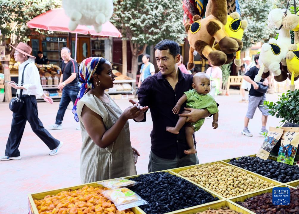 迪力夏提抱著(zhù)孩子和海迪雅在喀什古城景區的一家店鋪前挑選美食(9月7日攝)。