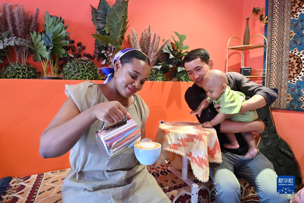 海迪雅在自家咖啡館內為顧客制作咖啡,丈夫迪力夏提抱著(zhù)孩子伴其身旁(9月7日攝)。