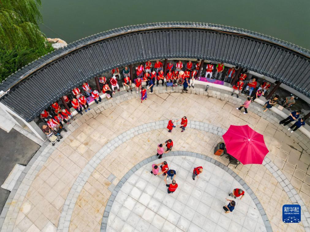 9月12日,河北省唐山市古冶區一家養老機構的老人們在院子里休閑(無(wú)人機照片)。